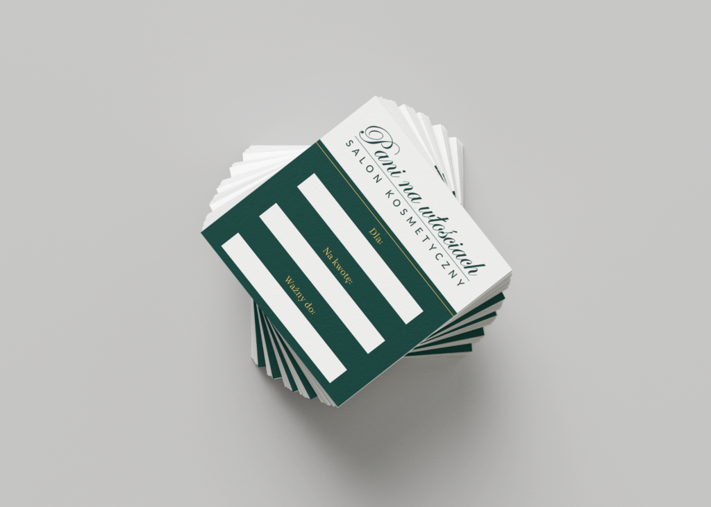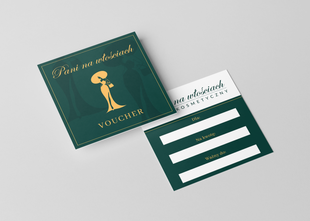“Pani na włościach” to luksusowy salon kosmetyczny położony na obrzeżach Wrocławia. Właścicielka zwróciła się do mnie z prośbą odświeżenia projektu oraz formy vouchera — znudził jej się prostokątny kształt i czarno-biała kolorystyka. Zależało jej na tym, aby uchwycić niepowtarzalny charakter swojego biznesu, nie tracąc przy tym elementów dobrze znanych klientkom.